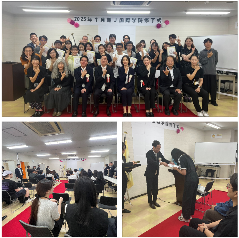 今日は7月期の卒業・修了式でした。 本科生・短期生たくさんの学生がJ国際学院での生活を終え、それぞれ新しい生活がスタートします。 みなさん、J国際学院での生活は楽しかったですか?日本語はたくさん学ぶことができたでしょうか。 これからも、たくさん日本語に触れて、日本語を使ってくださいね。いつでも先生に会いに来てください。 ご卒業おめでとうございます。